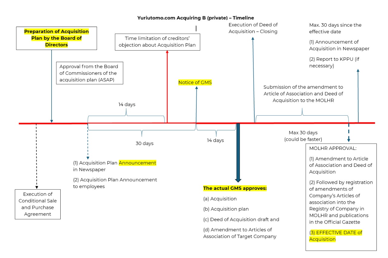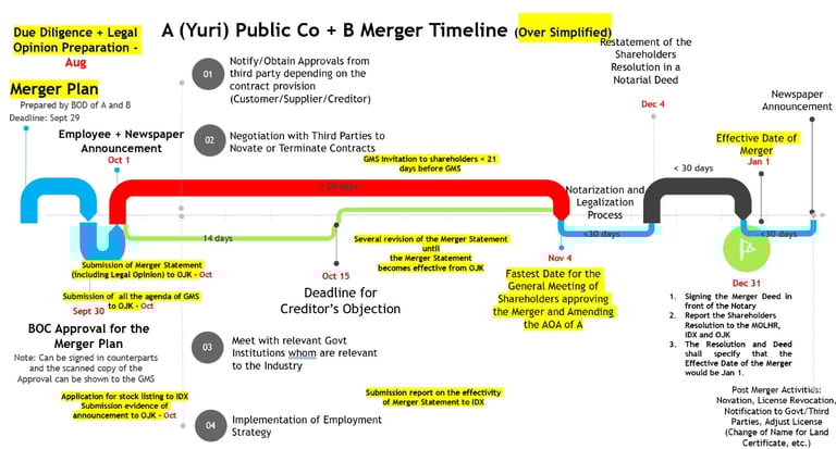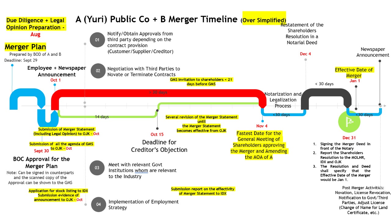 Yuriutomo describes a timeline for a merger between a public company and a private company (subsidiary). We simplify the timeline without explaining the many OJK and IDX provisions that must be met.